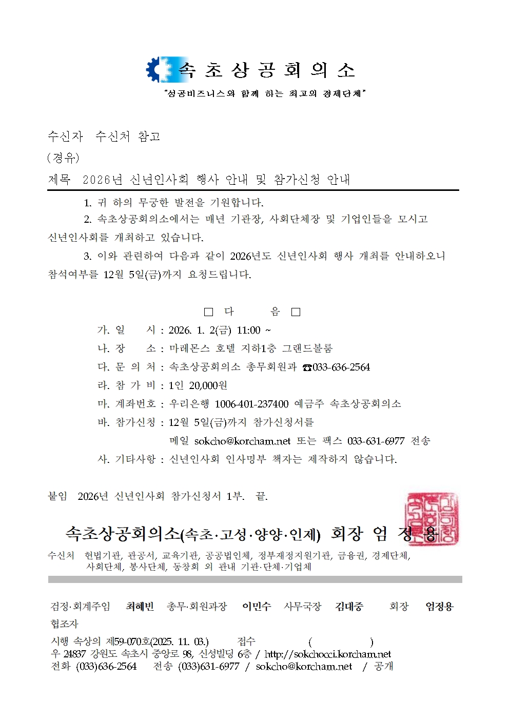 대표전화 : Tel:033)633-2564, 636-2564 Fax:631-6977, 823-1020 문의 : sokcho@korcham.net