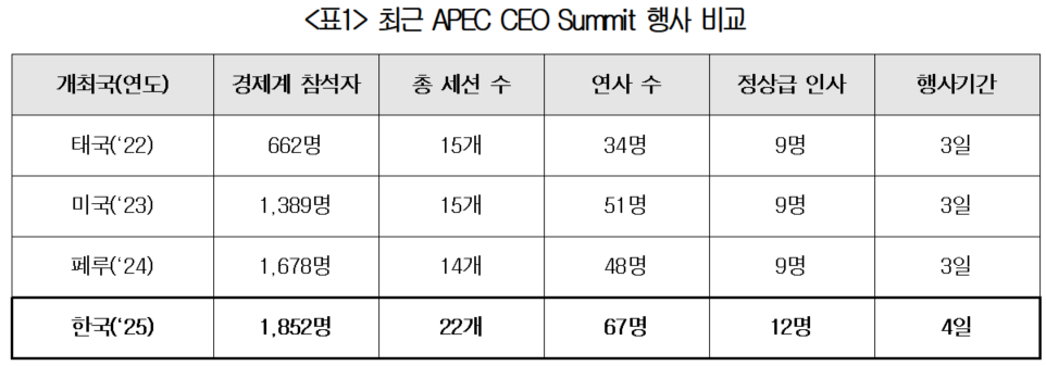 ‘APEC CEO 서밋’… 글로벌 경제포럼 새 지평 열다 - 경제·기술·문화·비즈니스 융합한 ‘K-APEC’ 전 세계에 알려... “역대 가장 역동적 APEC 행사” 호평 - 대한상의 ‘APEC CEO 서밋’ 주요 성과 발표... 역대 최대규모인원 ․ 최다세션 ‧ 최장기간 열려 - CEO 서밋 부대행사에 약 2만5천여명(누적기준) 참가... APEC 계기 경주지역 방문객 22.8% 증가