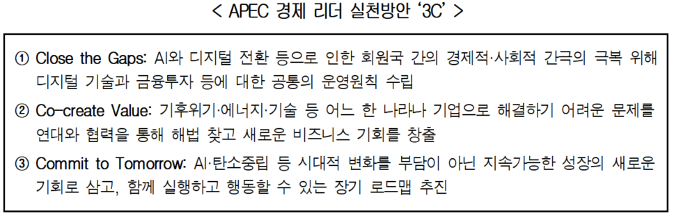 실제, APEC 이후 참석 기업들은 ▲글로벌 AI 데이터센터 공동 투자 검토 ▲반도체 공급망 재편 및 기술 파트너십 강화 논의 ▲한국을 글로벌 테스트베드로 활용하는 신기술 실증 모델 제안 ▲글로벌 CEO 연계 투자 및 혁신 채널 구축 등에 대한 후속 협력을 논의하고 있다.