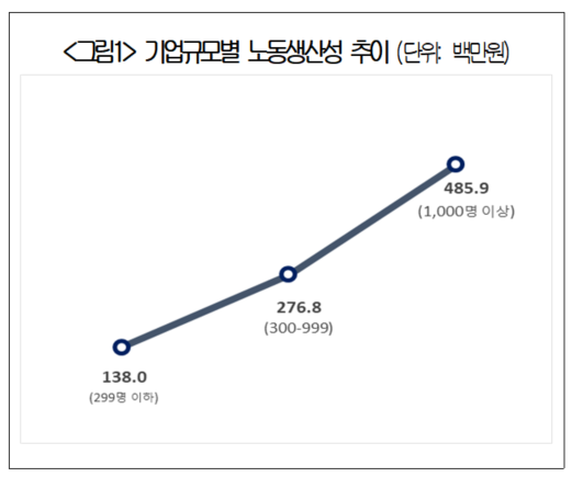 대한상공회의소(회장 최태원)가 26일 발표한 ‘K-성장시리즈(9): 기업규모별 생산성 추이와 시사점 연구’보고서에 따르면, “중소기업(299명 이하) 사업장의 1인당 평균 노동생산성(연간 부가가치)은 1억3800만원이고 중견규모 기업(300~1000명)의 생산성은 2억7680만원으로 2.0배 높아진다. 대기업 수준으로 가면 4억8590만원으로 3.5배 높아지는 것으로 계산됐다”고 말했다.