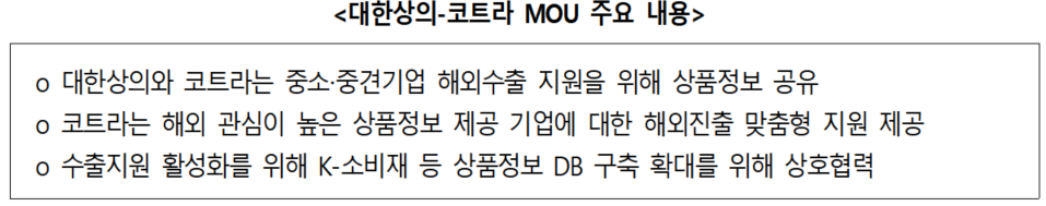 K-소비재 상품에 대한 실시간 정보제공으로 중소업체 수출지원 - 대한상의-코트라 「상품데이터 활용 중소‧중견기업 해외수출 지원 MOU」 체결 - 상품정보 DB 활용 유망상품 추천, 해외바이어ㆍ시장 매칭, 해외 유통망 입점 등 맞춤형 지원
